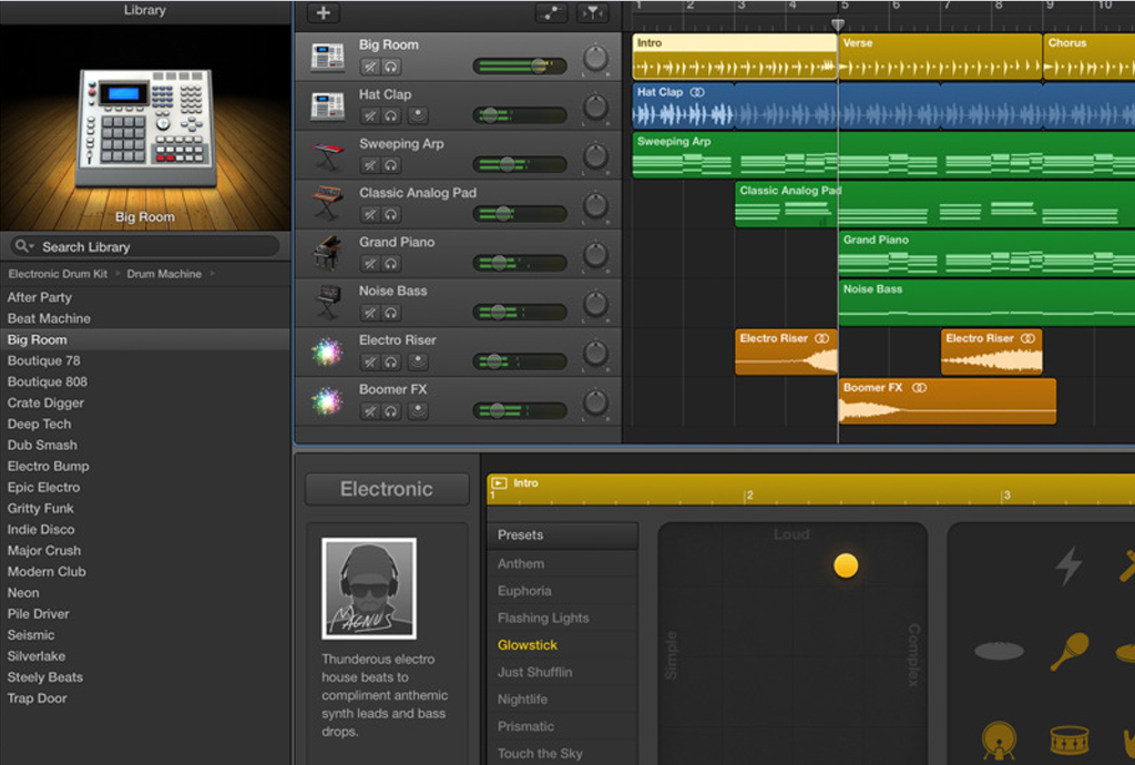 GarageBand supports 24-bit audio, offers basic pitch and time correction, and enables podcasting and soundtrack creation for video projects. It’s also a fantastic stepping stone for learning the ropes of digital audio production before moving on to Logic Pro X, Apple’s professional DAW.