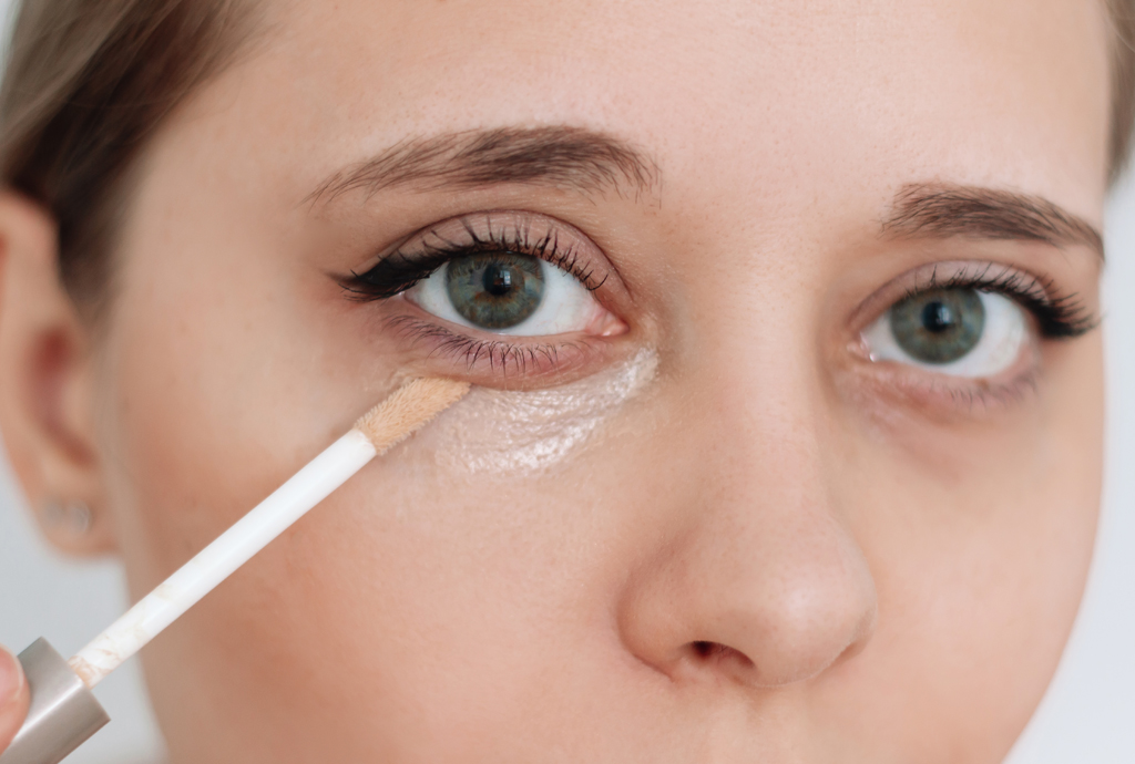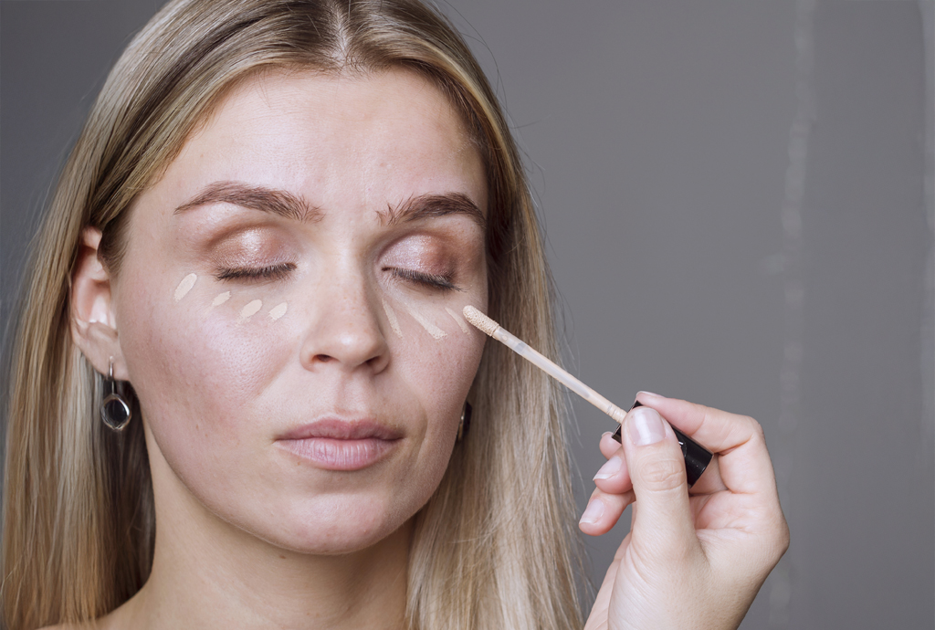 Dot concealer under eyes, blending to brighten, a go-to from makeup steps for beginners.