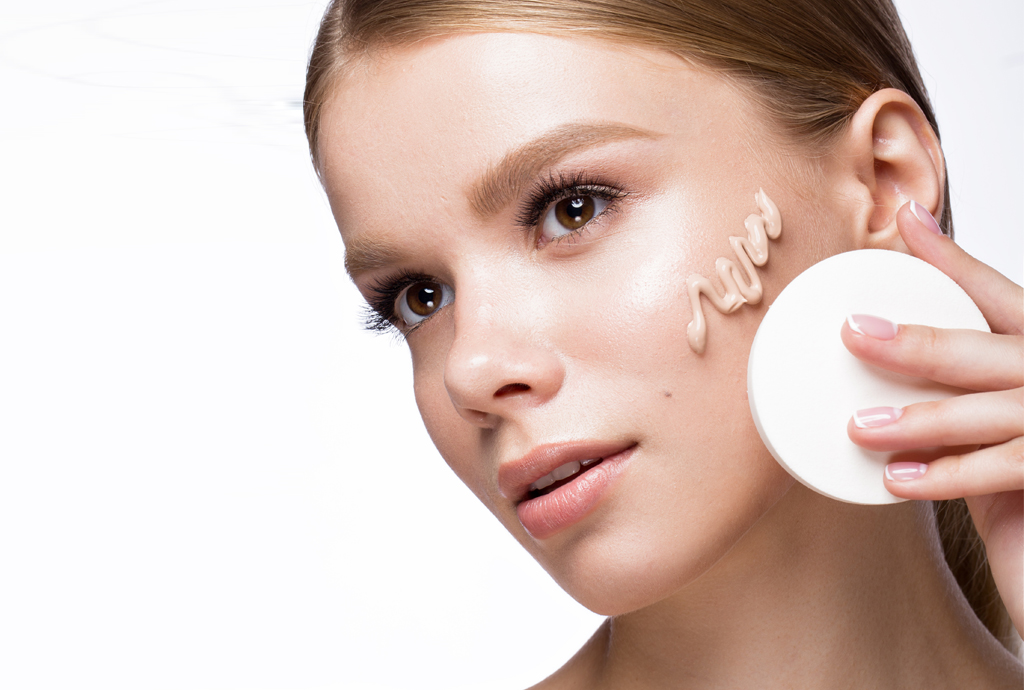Blend foundation with a damp sponge, especially at the jaw, for a pro face makeup step-by-step.