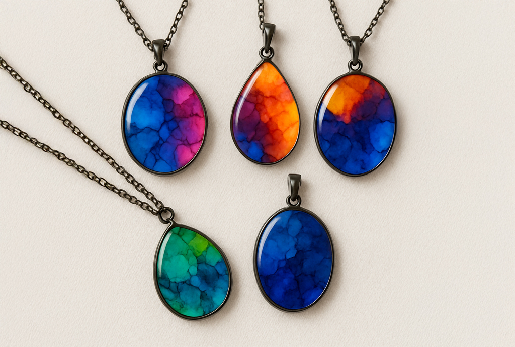 Alcohol inks create fluid, abstract designs in resin jewelry, perfect for unique resin jewelry ideas. Drop inks into wet resin and manipulate with toothpicks for swirls. Seal with a clear epoxy resin jewelry topcoat to protect the vibrant patterns, achievable with a resin jewelry kit.
