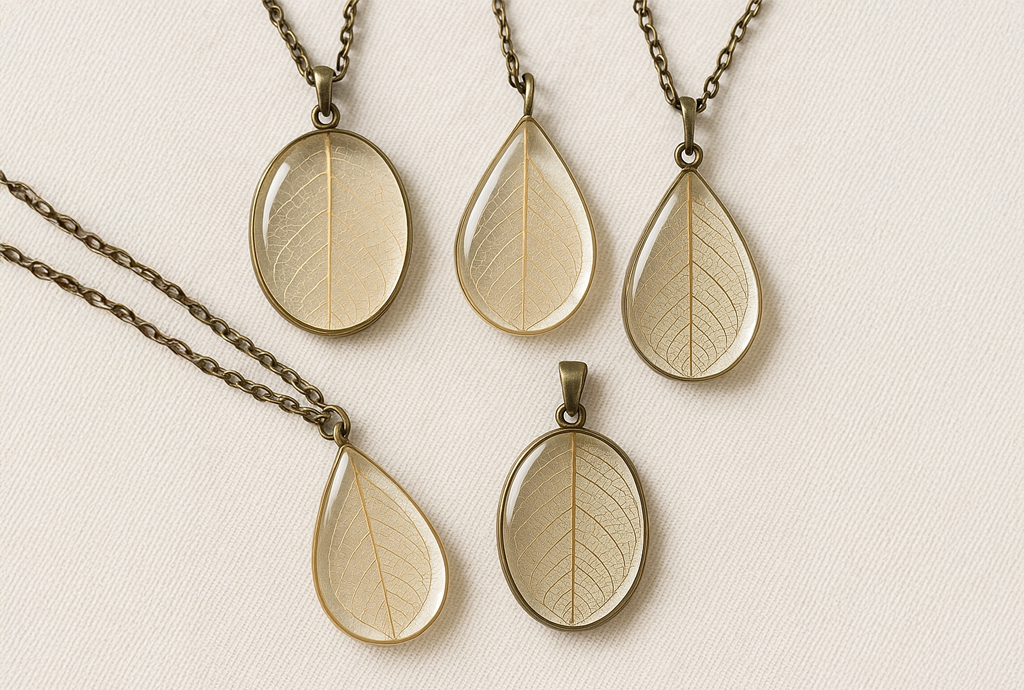Leaf skeleton jewelry, a unique resin jewelry idea, uses translucent leaf veins embedded in resin for an ethereal look. These delicate structures require careful handling in resin jewelry molds to avoid tearing. Clear epoxy resin jewelry highlights their fragility, making them a standout in resin art jewelry.